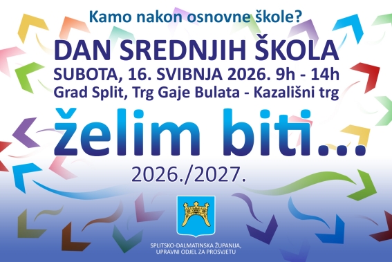 Manifestacija Dan srednjih škola Splitsko dalmatinske županije će se održati u subotu 16. svibnja 2026. od 9 do 14 sati na prostoru Kazališnog trga – Trga Gaje Bulata, na platou ispred zgrade Hrvatskog narodnog kazališta u Splitu.